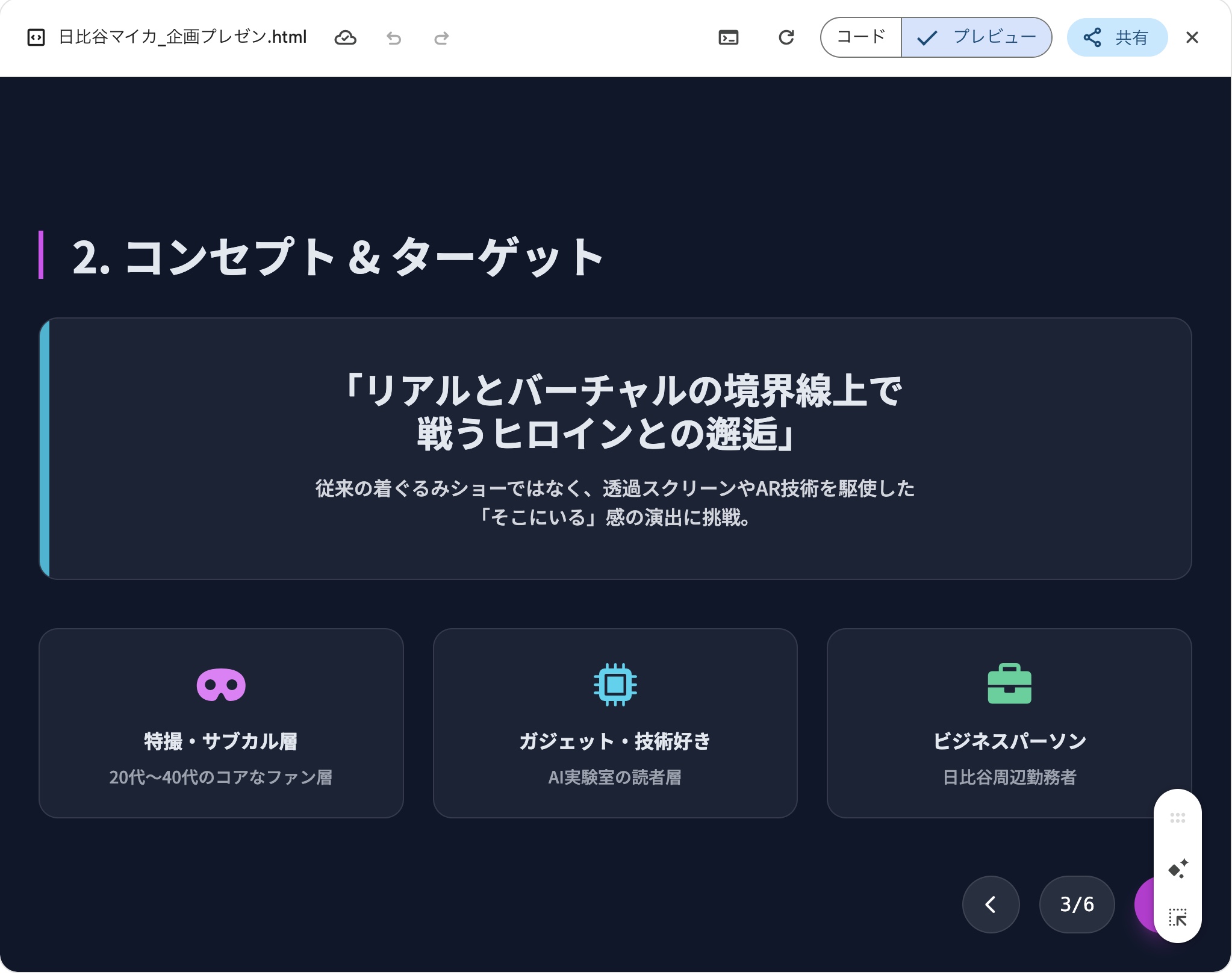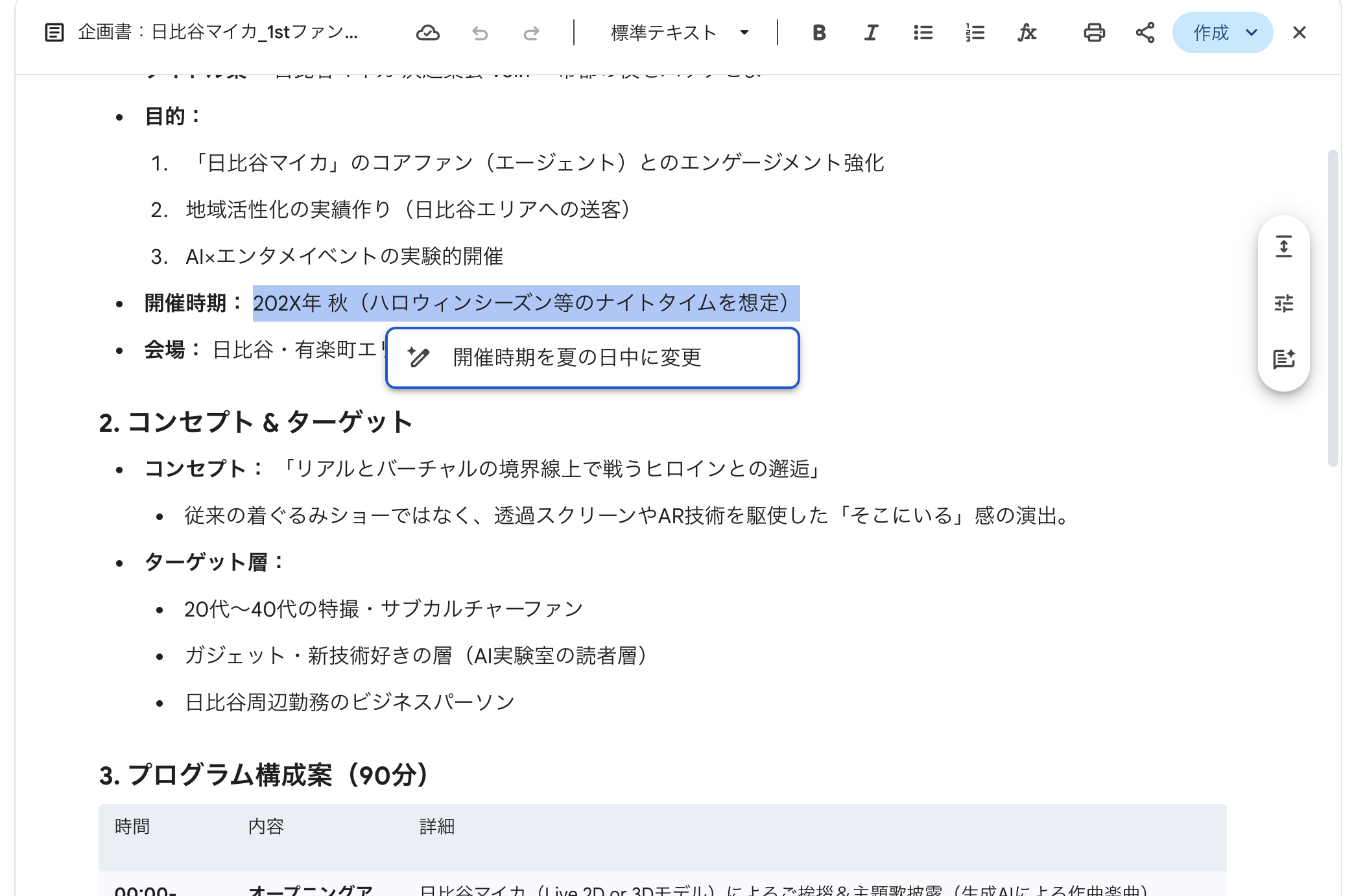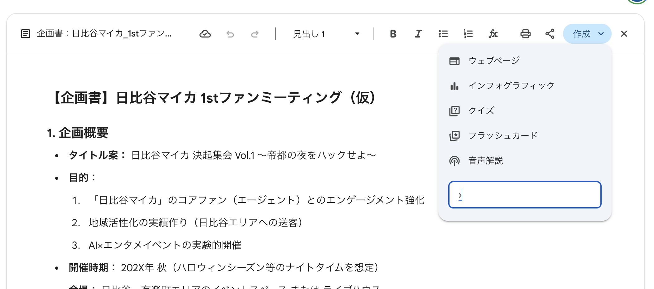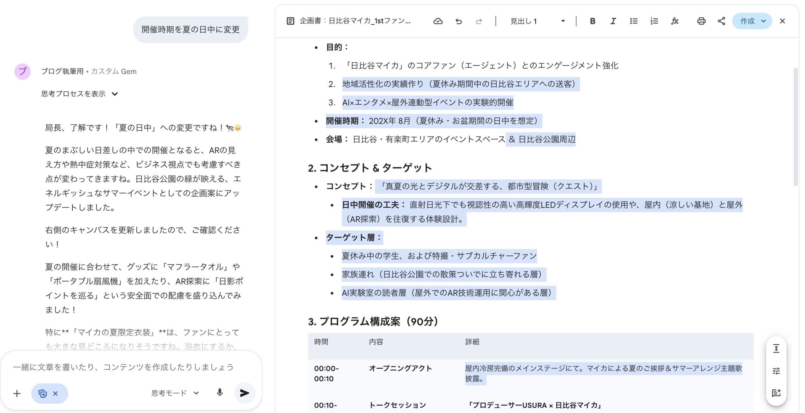 Geminiの「Canvas」は、画面が左右に分割されます。例えば、地域活性化バトルキャラクター「日比谷マイカ」という私のオリジナルキャラクターがいるのですが、その日比谷マイカを使ったイベントの企画書を作成しようと思います。