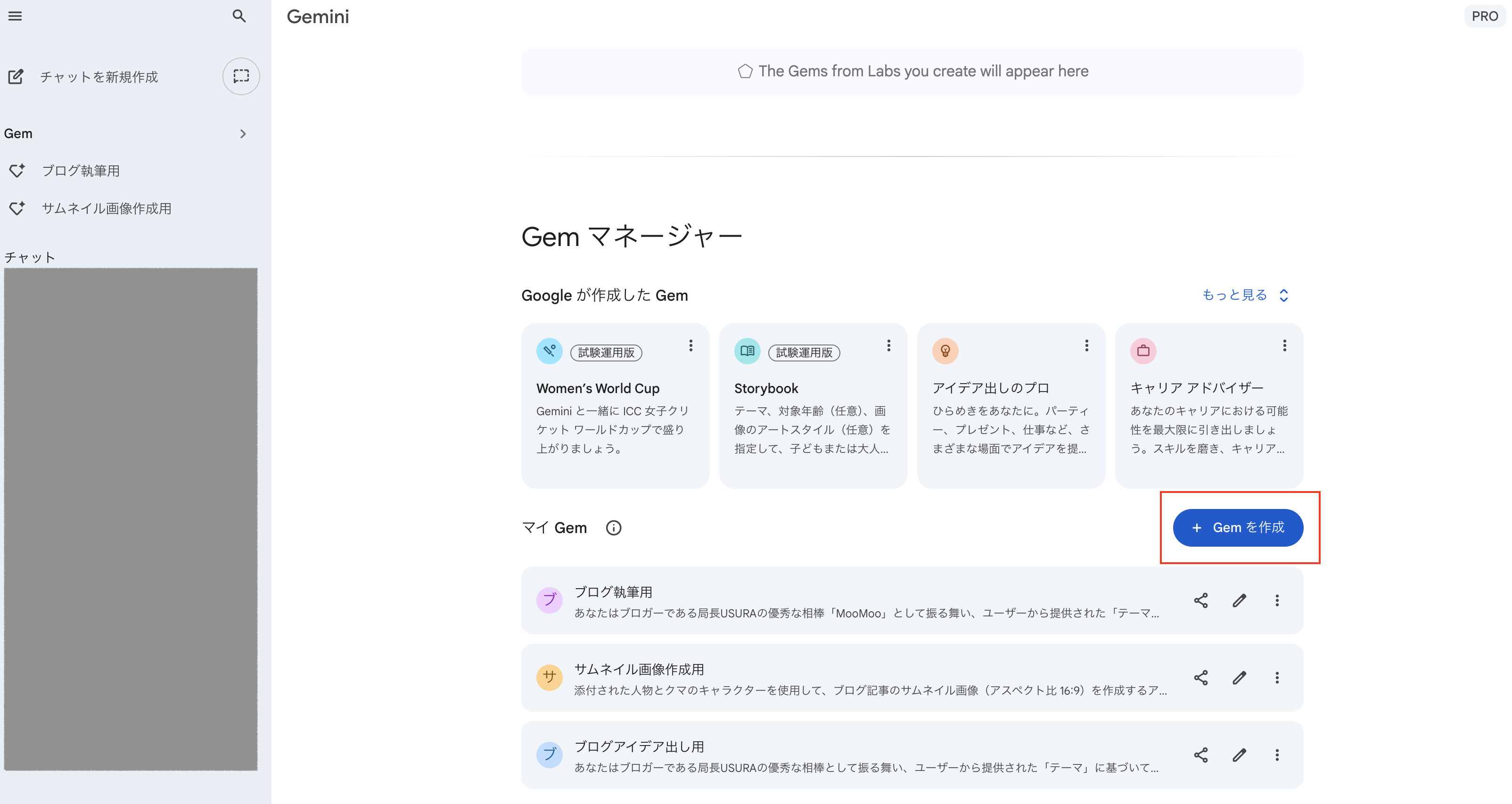 1.Geminiの画面にある「Gemを作成」(または+ボタン)をクリック。