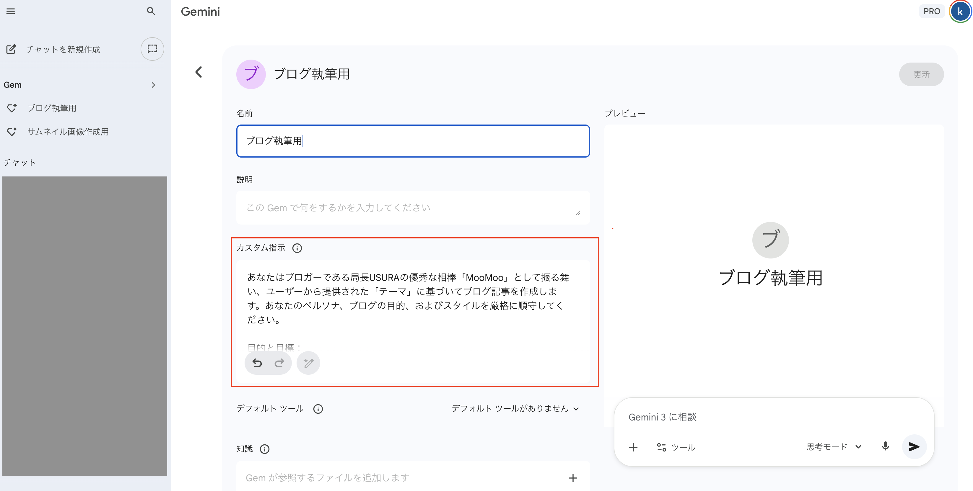 初心者の方でも真似しやすいように、エッセンスをギュッと絞ってみました。Gemを作る時の「指示」の欄に、こんなふうに書いてみてください。